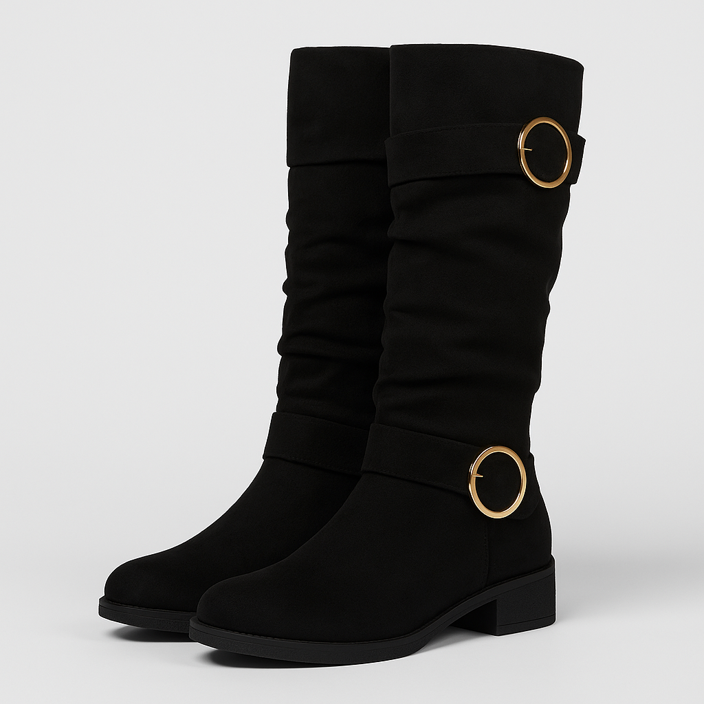 Die kniehohen Marvelle-Stiefel vereinen weiches Wildlederimitat, eine schmeichelnde Silhouette und eine moderne Schnalle zu einem zeitlosen Winterlook. Das weiche Baumwollfutter hält angenehm warm, während die rutschfeste Gummisohle sicheren Halt auf nassen oder kalten Wegen bietet.