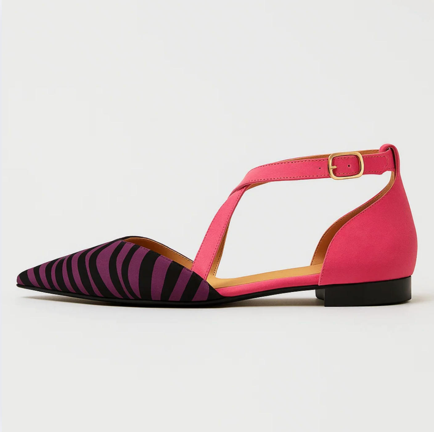 Die Zebra Chic Ballerinas (Elayna) setzen ein modisches Statement mit ihrer markanten Zebra-Print-Optik und den lebendigen fuchsiafarbenen Riemen, die sich elegant über den Spann kreuzen. Das Design ist mutig und zugleich raffiniert – perfekt für Frauen, die ihren Stil selbstbewusst unterstreichen möchten, ohne auf Komfort zu verzichten.